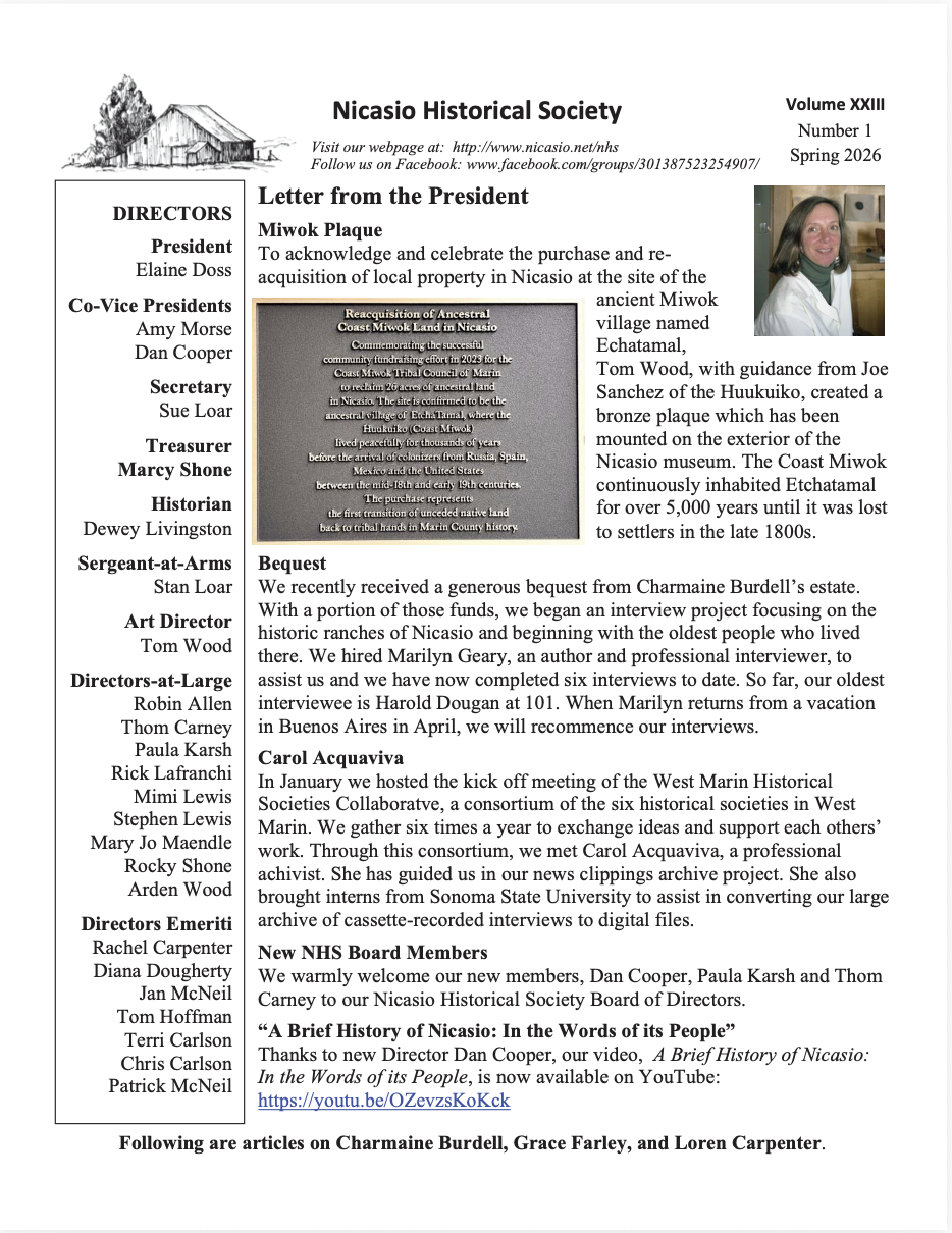 The Nicasio Historical Society welcomes anyone who has an interest in Marin history. Your membership helps support our efforts to preserve, share and celebrate Nicasio's history with our members. Your membership includes two issues annually of the Nicasio Historical society Newsletter, which features articles and photographs about Nicasio past and present, updates regarding our Society's progress, advance notice of upcoming events and interesting and informative interview transcripts.